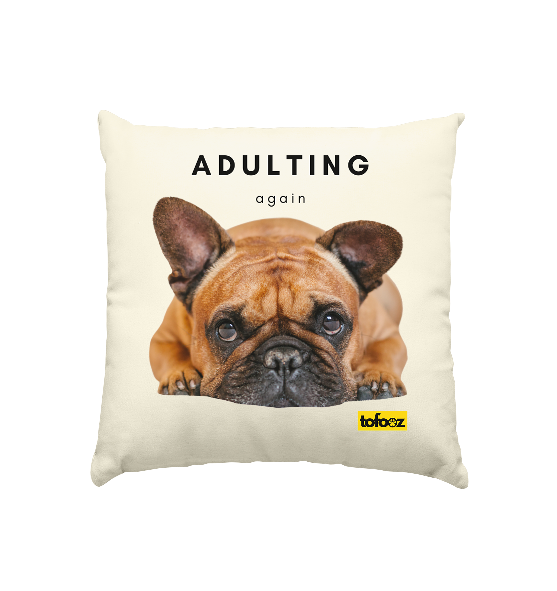 Introducing Tofooz-Designed latest collection: "Adulting Again" featuring a beloved French Bulldog! Each cushion is designed to add a touch of fun and whimsy to your everyday routine. Shop now and add a dash of Frenchie flair to your adulting adventures!