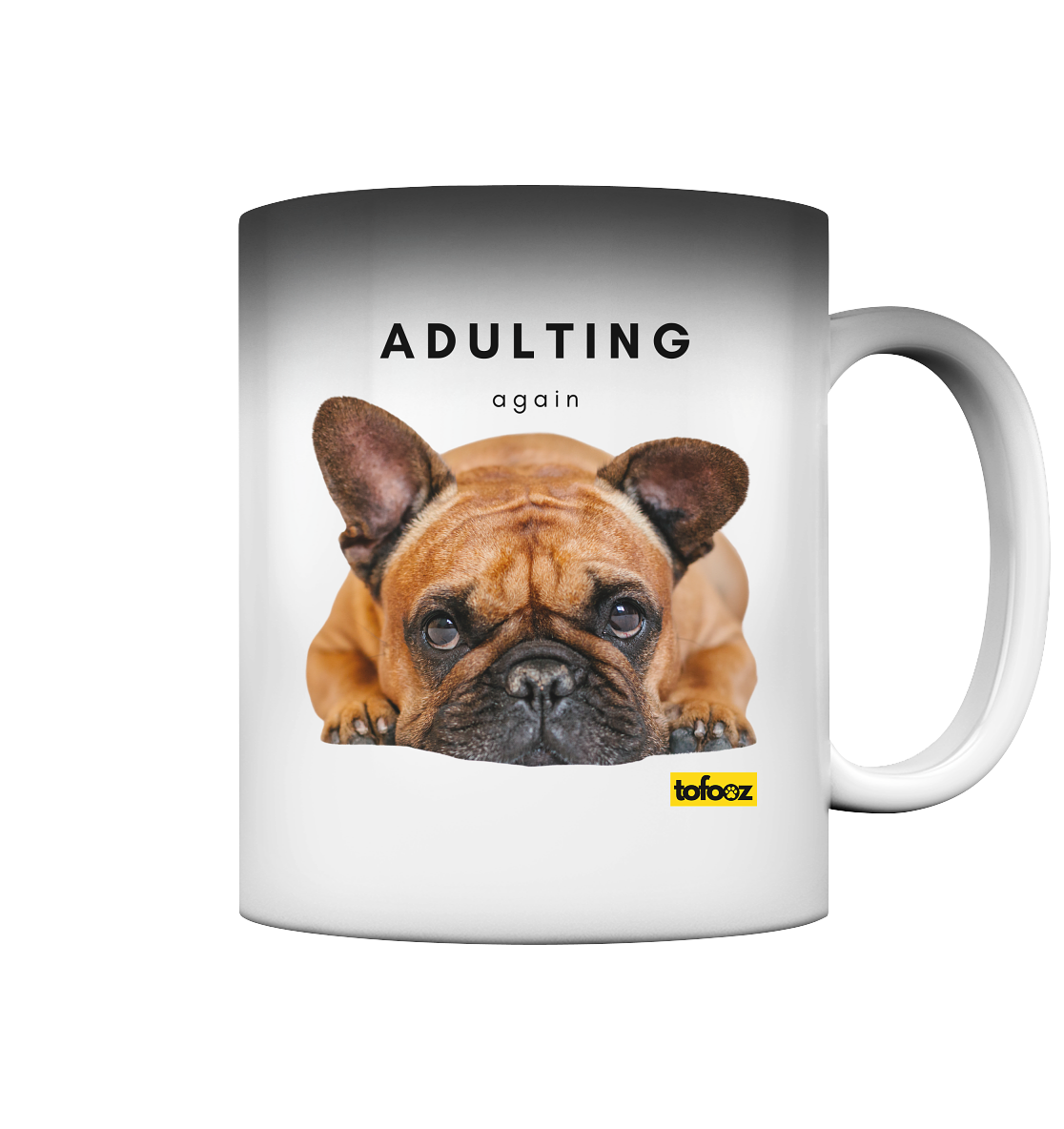 Introducing Tofooz-Designed latest collection: "Adulting Again" featuring a beloved French Bulldog! Embrace the enchanting experience of watching the mug change color when filled with a hot beverage. Shop now and add a dash of Frenchie flair to your adulting adventures!